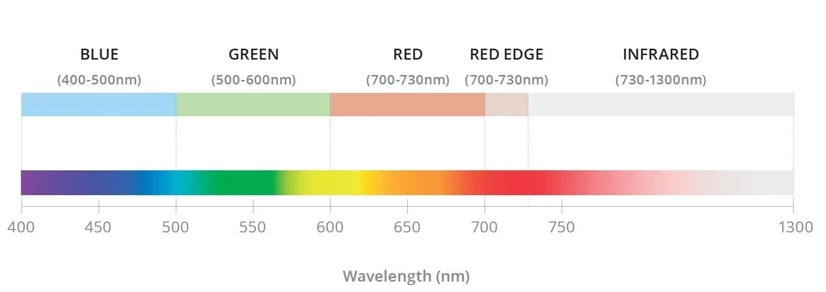 | Red Edge | 700-750 nm | Find signs of early vegetation stress |